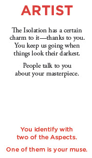 Character generation is a choice from archetype character cards. What's fascinating is that your character card also is tied to the Aspects in some manner, for example I chose the Artist: